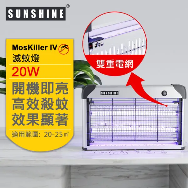 – UV紫外螢光燈發出的光源,引誘蚊蟲飛入,再以外圍雙重高壓電網將蚊子瞬間電死。