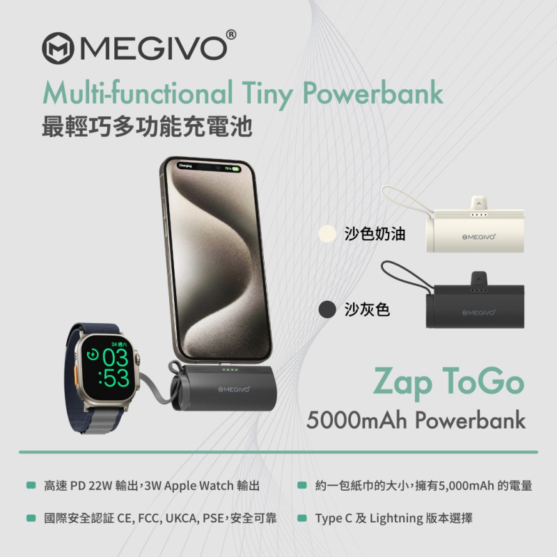 最新推出的Zap ToGo 同一包紙巾差不多大,而有5,000mAh 既電量,足夠為你的iPhone 15 Pro 提供多1次的續航力,而且我地既今次更加入Apple Watch 的充電功能,除了充手機仲可以同時充埋Apple Watch。