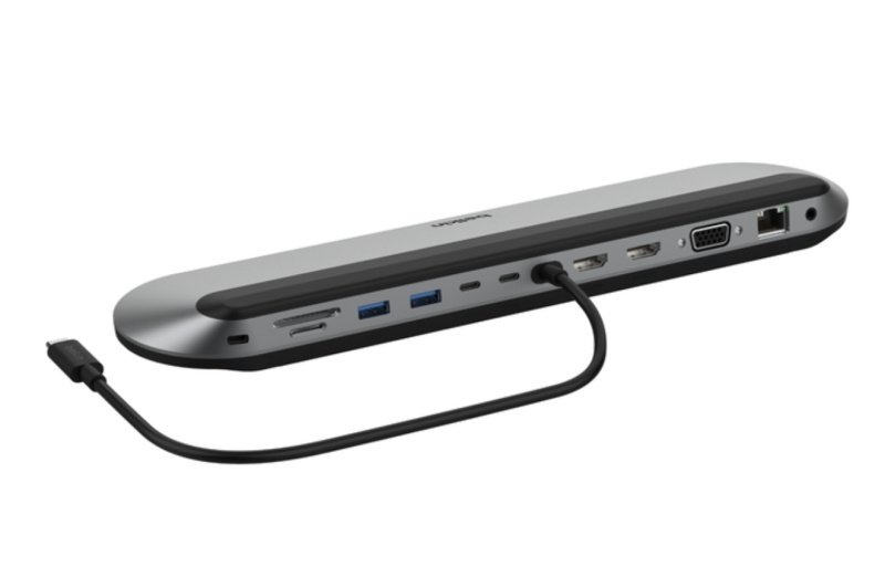 這款擴充基座可充當手提電腦支架,置於中央的 USB-C 線更便於使用,桌面更整齊。