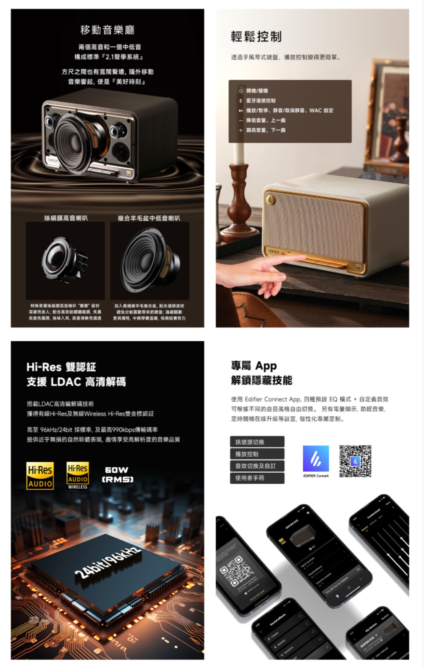 桌面無線音箱 30W+15W*2 (RMS) 總輸出功率,採用 D 類 TI 數位放大器晶片 全數位訊號處理、雙向主動分頻和動態範圍控制 雙低音反射通道帶來強勁低音 高解析度音訊無線傳輸 WiFi 連線(Apple iPhone、iPad、Apple TV 和附 iTunes 的電腦) 5GHz和2.4GHz雙頻WiFi模組 與 Apple AirPlay2 搭配使用 投射本地曲目並將線上音樂傳輸到揚聲器 支援 AAC 和 ALAC 編解碼器