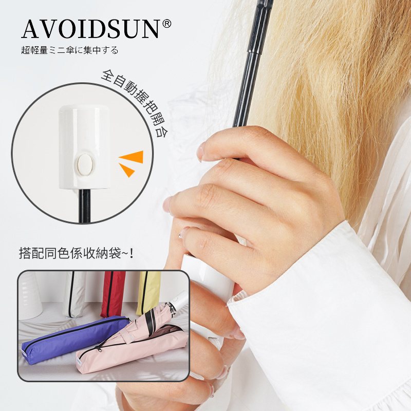 ·黑膠防嗮塗層,防UV紫外線功能99%以上,UPF 50+,遮光率99.99%,防曬遮雨,晴雨兼用 ·防潑水面料,落水成珠,一甩即干 ·只需輕輕一按即可打開和關閉,因此在行李多的日子或乘車旅行時非常方便 ·傘骨採用碳纖維材料,耐用不易生鏽 ·傘下直徑96cm,收納為25cm,重量僅約172g ·多色可選擇,搭配同色係收納袋,方便攜帶