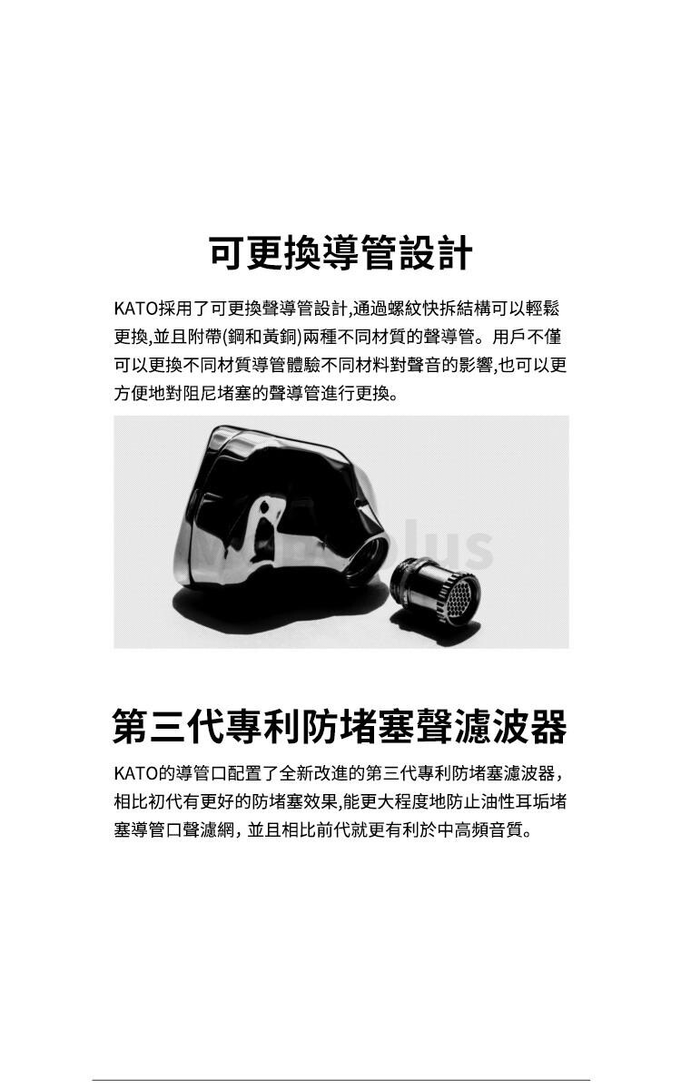 KATO採用可更換的聲音噴嘴設計,可以很容易地用帶螺紋的快速釋放結構代替,並配有由兩種不同資料(鋼和黃銅)製成的聲音噴嘴。 用戶不僅可以通過更換噴嘴來體驗不同資料的聲音變化,還可以更方便地更換堵塞的聲音噴嘴。